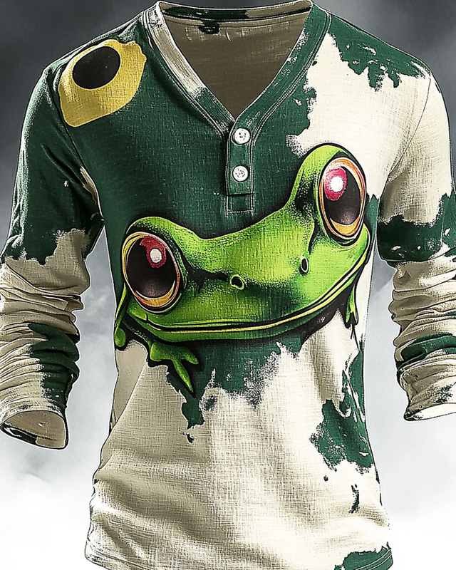 Men's Spring/Summer Color-Blocking Playful Frog Embroidered Long-Sleeve Top 7383