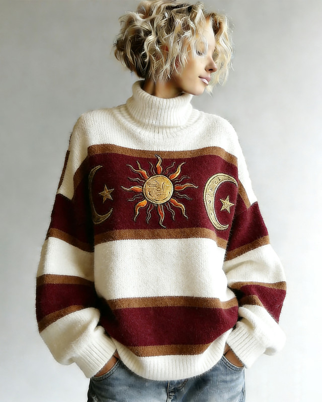 Women's Winter Fashionable Star and Moon Embroidery Color Block High Neck Sweater 3452