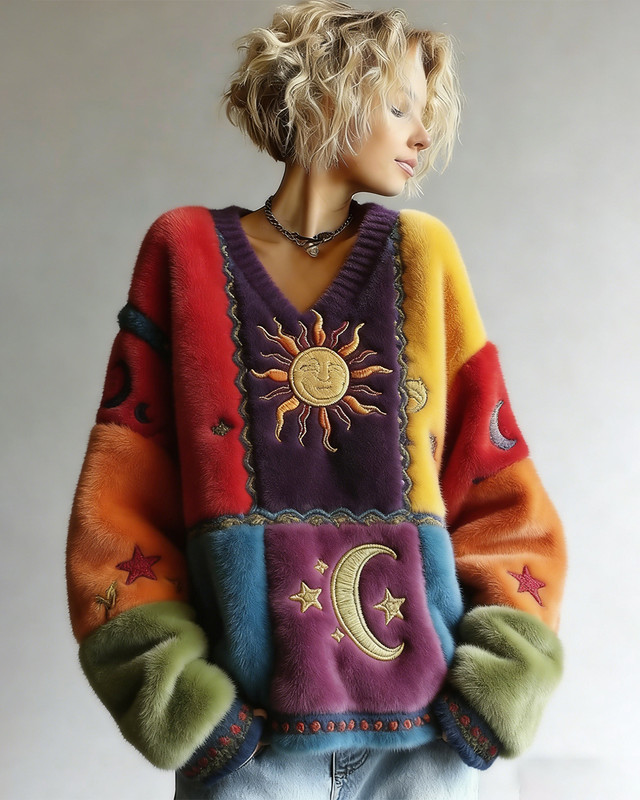 Women's Winter Fashion Star and Moon Embroidery Color Block V-Neck Sweatshirt 8407