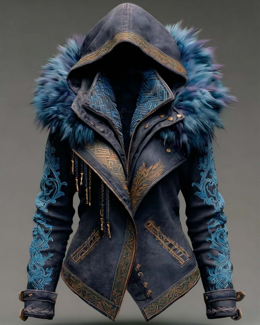 Women's Winter Viking Embroidered Fur-Trimmed Hooded Leather Jacket 9095